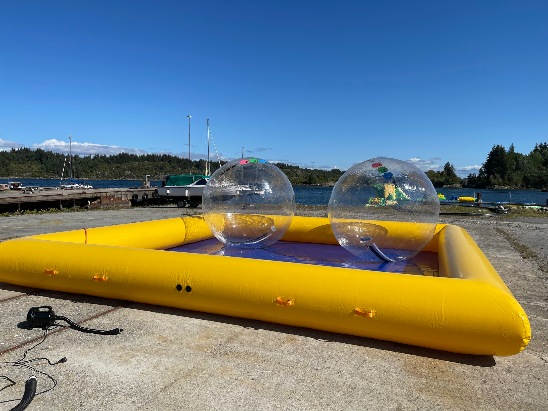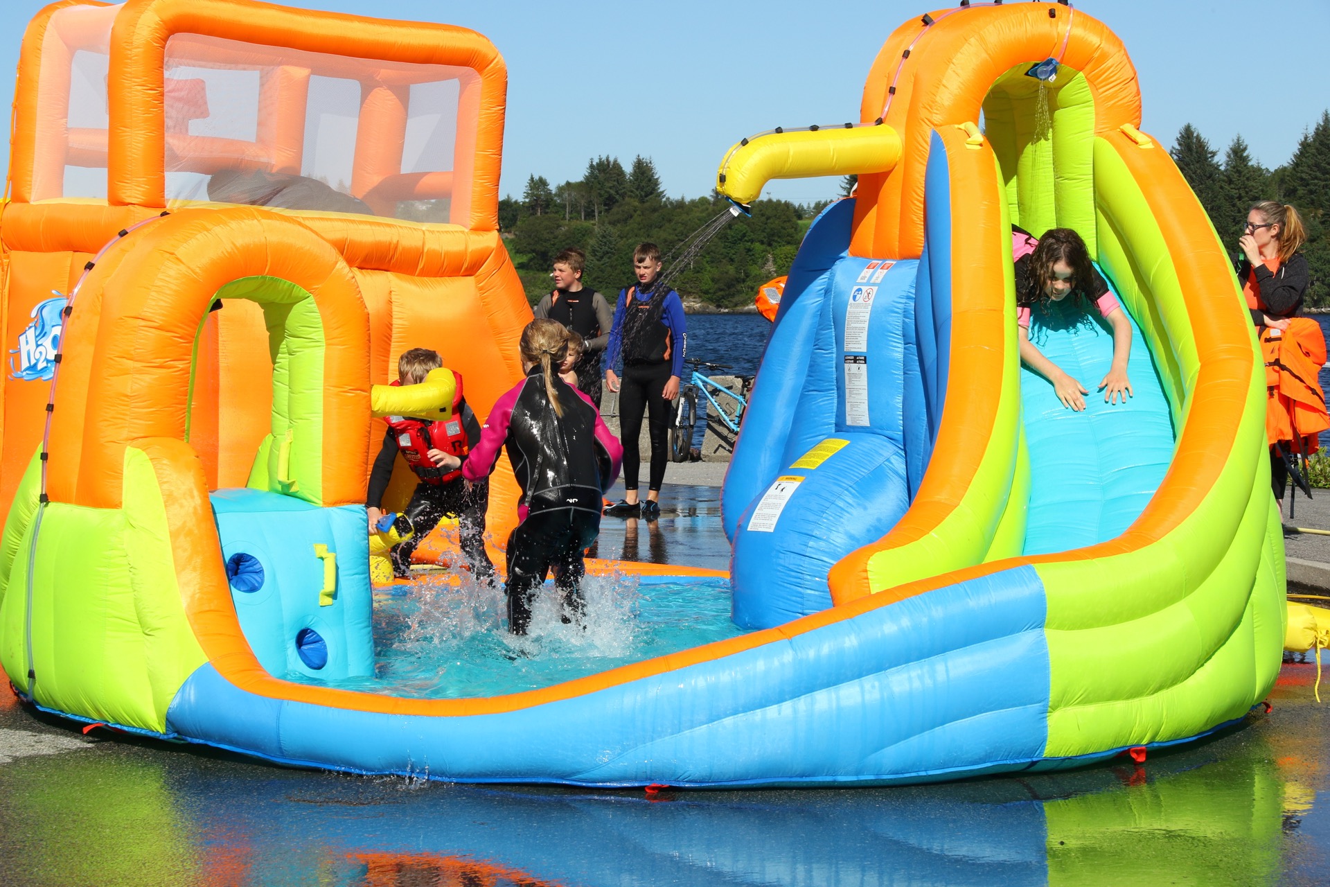 Du kan hoppe på vasstrampoline, verte skutt ut av katapulten vår, springe i hamsterhjul, prøve hoppe/ klatretårnet vårt og hinderløypa, alt på sjøen.